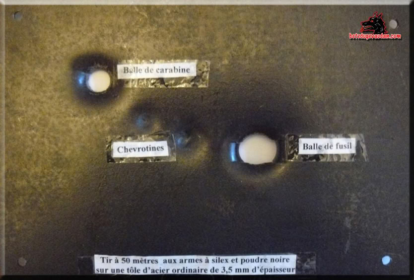 A 24-caliber rifle (15.1 mm in the 18th century, 14.7 mm today because of the 1911 reform) sends its well-planned bullet at 360 meters per second for a powder charge of 3.5 grams (4.5 grams in the 18th century). She pierces an 18cm pine beam at 50 meters (The back of the beam bursts). If the beam is 30 cm long, the penetration does not cause splitting, and is only 8 cm.