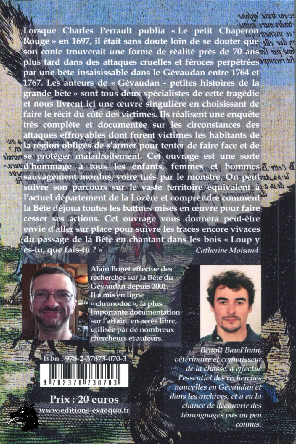 Les auteurs : Alain Bonet effectue des recherches sur la Bête du Gévaudan depuis 2001. Il a mis en ligne la « chronodoc », la plus importante documentation sur l’affaire en accès libre, utilisée par de nombreux chercheurs et auteurs.