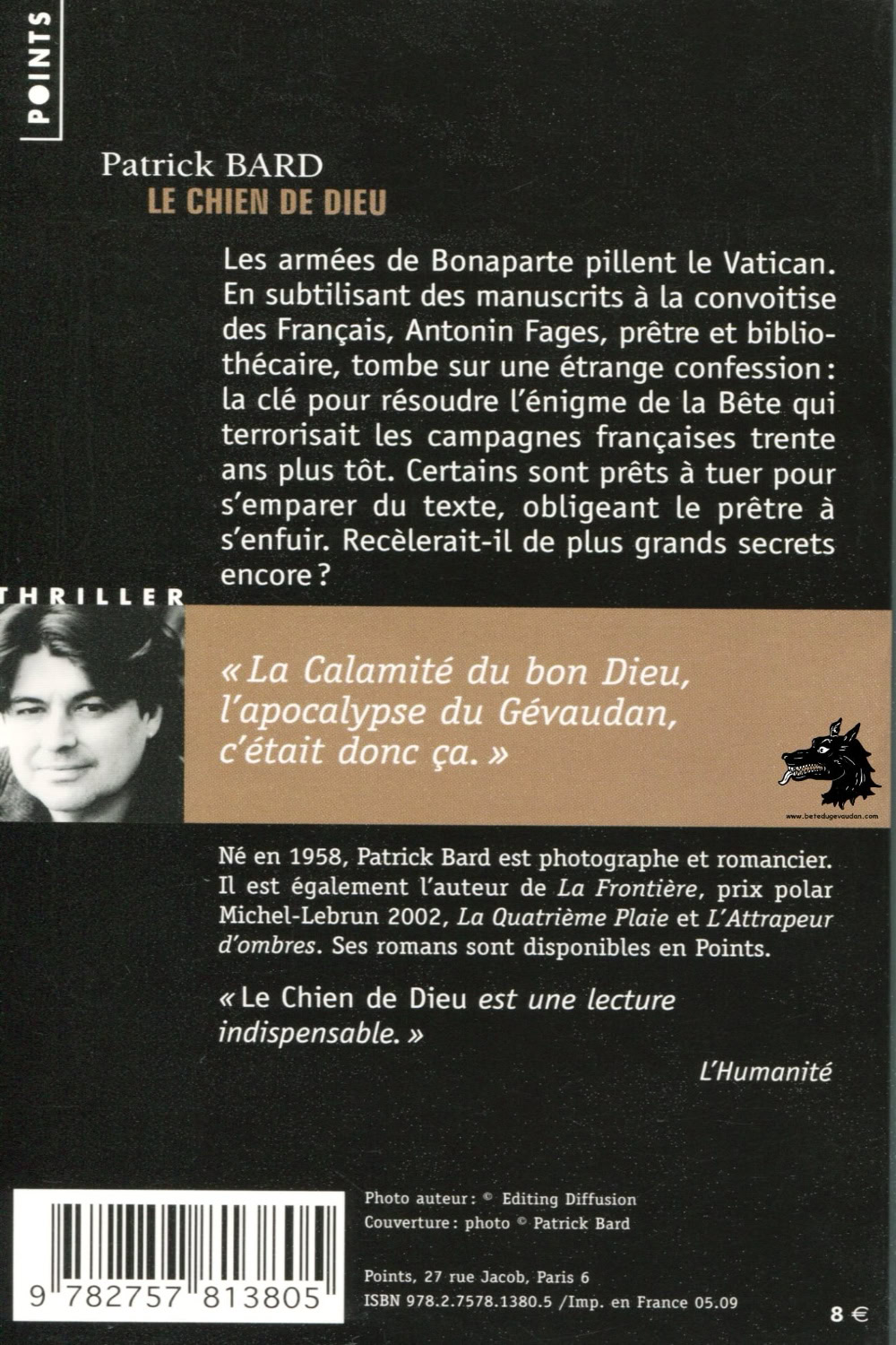 L’auteur : Né en 1958, est un photojournaliste, romancier, écrivain-voyageur. Depuis longtemps, Patrick Bard a choisi comme lieu de villégiature le village de La Canourgue en Lozère, non loin des lieux où se sont déroulés les événements de la bête du Gévaudan.